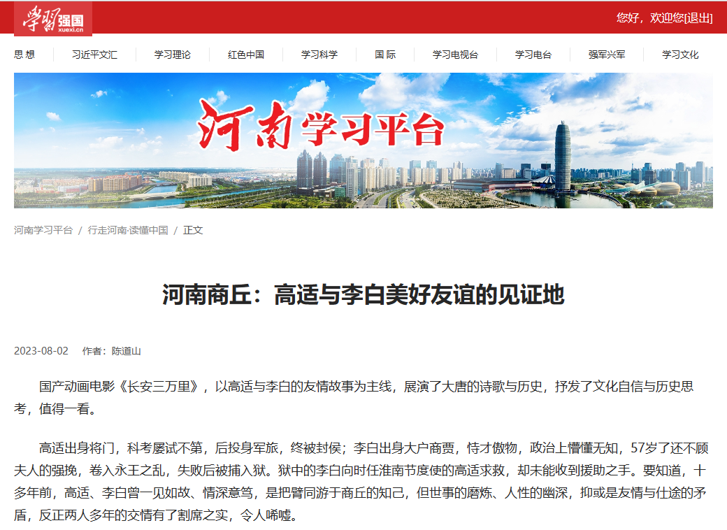 8月2日,“学习强国”河南学习平台发表了世界杯陈道山副院长的署名文章《河南商丘:高适与李白美好友谊的见证地》,这是学习强国平台首次发表世界杯教师的文章。文章继7月28日《商丘日报》刊发后,经地方宣传部门遴选推送至学习强国平台。