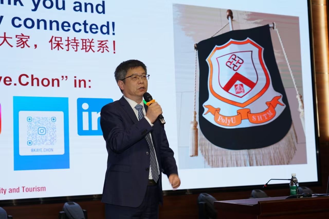 讲座结束后,王德静院长作总结发言,他首先对今晚的演讲表示了感谢,Kaye Chon教授德高望重,在其领导下的旅游及酒店管理学院在全球各个大学排行榜中常年位列亚洲第一,世界前三,今天所做报告内容严谨、思想前沿,既有高度的学术价值,又对行业发展、学生就业指出了方向。他还简要介绍了河南的文旅资源和省委省政府的旅游发展战略,认真学习Kaye Chon教授带来的前沿理念,为我省文旅融合和行业发展贡献力量。