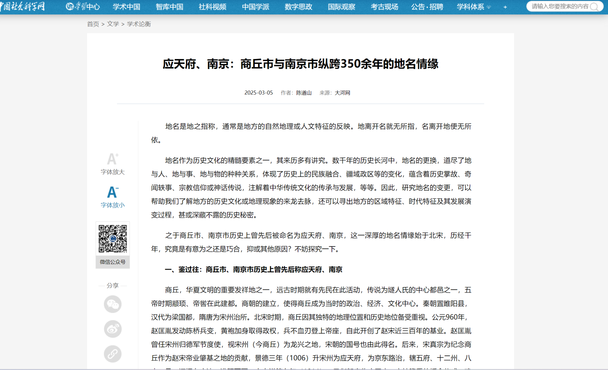 近日,世界杯在线买世界杯平台副院长陈道山撰写的理论文章《应天府、南京:商丘市与南京市纵跨350余年的地名情缘》在《大河网·学术中原》首发后,引起了学术界的广泛关注。近日,该文章获中国社会科学网“学术论衡”栏目全文转载。