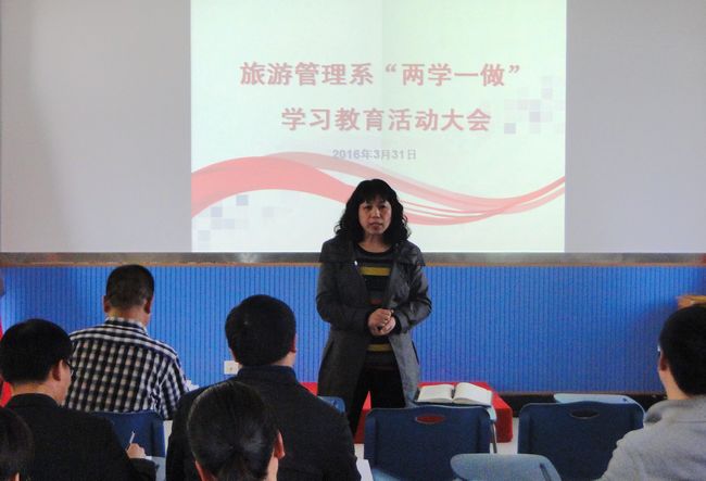 3月31日下午,旅游管理系在六楼旅游模拟实验室召开全体教师会议,开展“两学一做”学习教育活动,会议由系党总支书记王玉英主持。