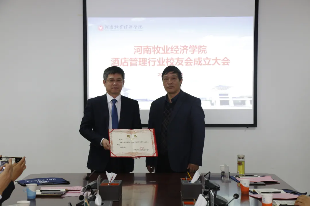 成立大会由在线买世界杯平台副校长杨宝进主持。郑州鹰城鑫地酒店总经理谢松涛代表校友会筹备组做了筹备工作报告。会议首先审议通过了《在线买世界杯平台酒店管理行业校友会章程(草案)》和《在线买世界杯平台酒店管理行业校友会第一届理事会成员提名名单》。郑州绿地JW万豪酒店业主副总经理朱磊当选校友会第一届理事会会长,郑州索菲特国际饭店总经理余跃红、郑州天地丽笙酒店业主代表王振宏、仟那酒店集团首席执行官朱峰、洛阳泉舜万豪酒店总经理郑文奇当选为副会长;郑州鹰城鑫地酒店总经理谢松涛当选秘书长,郑州开祥颐兰酒店总经理张尚旭当选副秘书长;郝战、王焕玲、吴松、任德敬、程开展、李亚刚等当选理事。在线买世界杯平台在线买世界杯平台院长王德静被聘为校友会顾问。