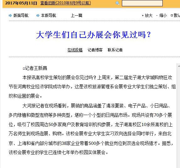 5月11日《大河报》以《大学生们自己办展会你见过吗?》为题,报道了我系会展专业实训项目:大学生购物狂欢节暨会展专业就业实习双选会的基本情况,彰显了我系专业实践教学的特色。相关链接http://newpaper.dahe.cn/dhb/html/2017-05/11/content_145449.htm