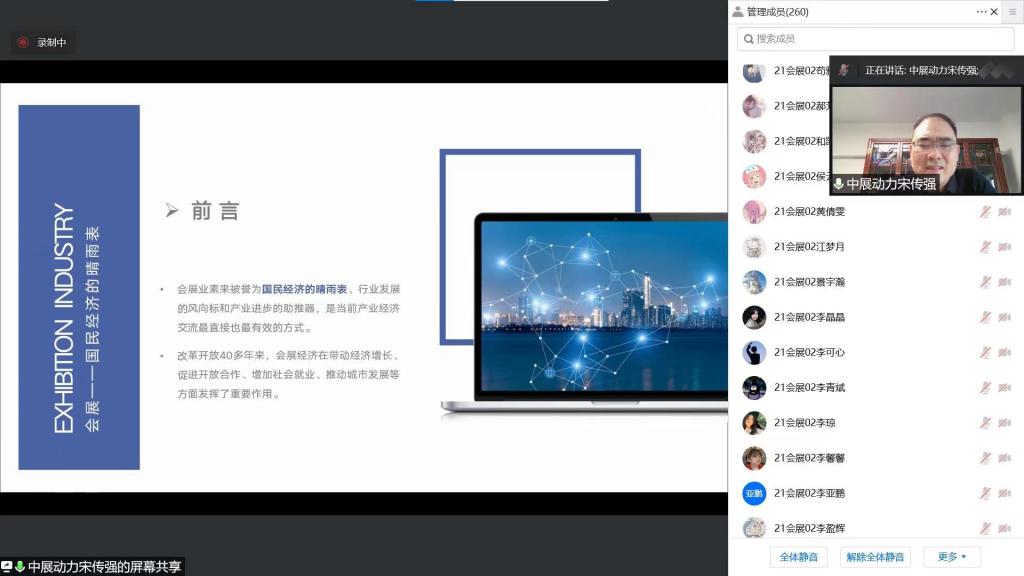 活动期间,特邀河南中展动力展览有限公司总经理宋传强、郑州海名汇博会展策划有限公司总经理肖奎先做了《后疫情时代会展行业危机应对及机制创新》和《会展企业及项目运营》线上专题讲座;组织学生通过文献收集、电话访问、网络直播等方式调研会展场馆、会展企业、会展项目和会展城市,并结合调研模块进行专题研讨。实践活动虽然在线上进行,由于组织得力,亦然取得较好的实践效果。两场专家讲座有500多师生参与直播互动,甚至有兄弟院校的师生参与活动。本次活动安排合理、内容丰富,专家报告精彩绝伦,教师指导认真负责,学生参与热情高涨,不仅加深了他们对行业企业的认知和了解、提升了专业实践能力,也增强的他们的专业信念,对会展行业未来的发展充满信心。