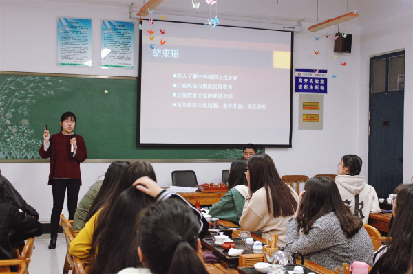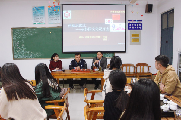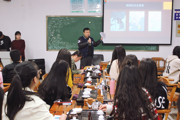 在热烈的掌声之中,辅导员段续良老师热情引领嘉宾入座 。随后座谈会在陈明副书记亲切畅快的主持中正式开讲。他为同学们阐释了深入了解韩国文化的意义:旅游活动是面向社会的学科,我们于学校中学习,将来必将服务于社会实践。随着国家的发展,我们必将会迎接大量的国际团体,其中韩国客人必是其中亮点。我们了解韩国文化,为将来做有益铺垫;得到社会接受,获得社会认同,必获得巨大的物质精神收获。作为主讲人之一的沙强老师更是深有同感,在学子殷切的目光中沙老师侃侃而谈。博闻强识的沙老师,以韩国历史为眼为我们切入其中,以极其富有感染力的语言,令学子如梦般的站立在历史的天空中,领略到一个对我们而言,少知而神秘的韩国历史。随后沙老师又将目光投向近现代,为我们细致入微的讲述了在时代洪流之下韩国发展的迅猛之速。乔老师则以自己留学经历为例,更加细致入微的讲述韩国人的生活文化习俗。大到国家的教育体制,小到日常的待人接物。她以一种睿智冷静的思维向我们清晰客观的剖析了中韩生活中一般人难以发现的细微差异,这不禁赢得了在座学子由衷地钦佩之情。云端之中,茶韵为伴;旅院之人,其志图南。参与讲座的几十名学子无不认真倾听着讲解,这既有良言抚慰,这亦有洪钟之声。耳听佳音,细品甘茗,学子们“遗忘”了时间,两位老师也“刻意”延绵了思绪。在接下来的互动环节之中,两位老师也是为学子们进行精彩解答,陈明副书记更是不时为两位老师的讲解进行简明的总结,以便使同学们更加深刻的领会要旨,可谓是画龙点睛。大家颇感受益良多,终身难忘的回忆铸成于此时此刻。无声乎?非也,君请听众学子叫绝之声不觉于耳也。