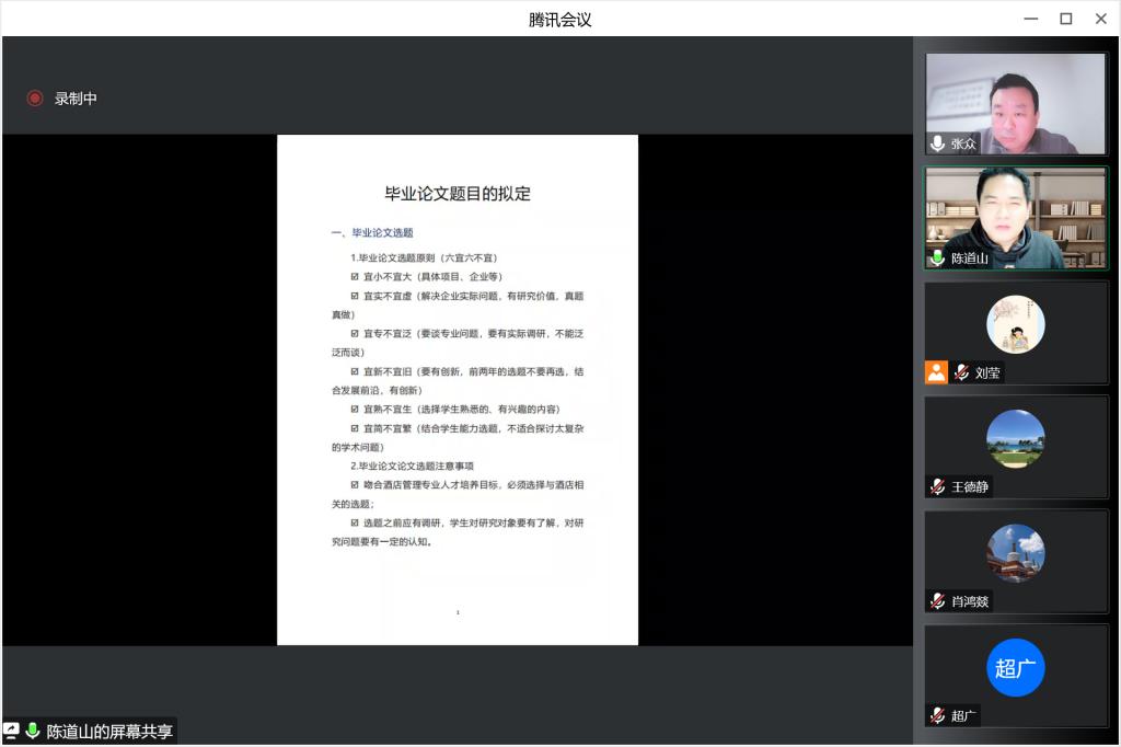 会议开始,张众主任就本次线上会议流程做出安排,刘莹副主任以近期酒店管理教研室对23届本科毕业论文的开题工作做了详细阐述。酒店管理教研室积极安排并顺利完成了学生与论文指导老师的双选;各位论文指导老师及时联系学生、耐心指导,与学生进行沟通;结合学生的文献掌握情况,给出相关选题。最终为207名学生选定论文题目。