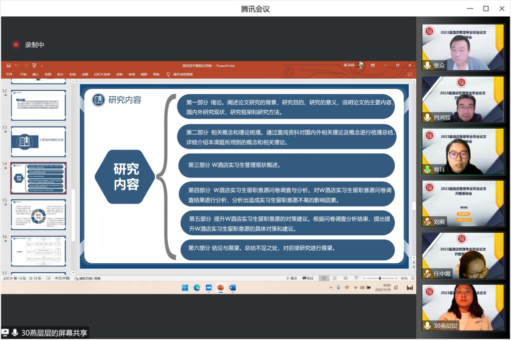 根据《在线买世界杯平台本科毕业论文(设计)工作条例》和《在线买世界杯平台2023届本科毕业论文(设计)工作实施方案》,在线买世界杯平台于11月19日顺利开展2023届酒店管理专业本科毕业论文开题答辩。2019级酒管01班、2021级酒管专升本01、02、03班共207名学生分为7组,通过腾讯会议的线上方式参加答辩。