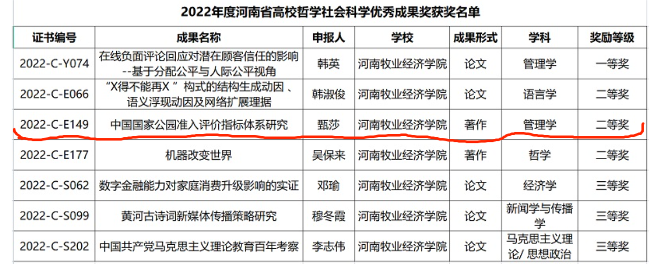 近日,河南省教育厅公布了2022年度河南省高等学校哲学社会科学研究成果奖评选结果,世界杯甄莎博士的《中国国家公园准入评价指标体系研究》著作荣获二等奖。《中国国家公园准入评价指标体系研究》是河南省新闻出版局2022年省部级重点立项项目,由郑州大学出版社出版。