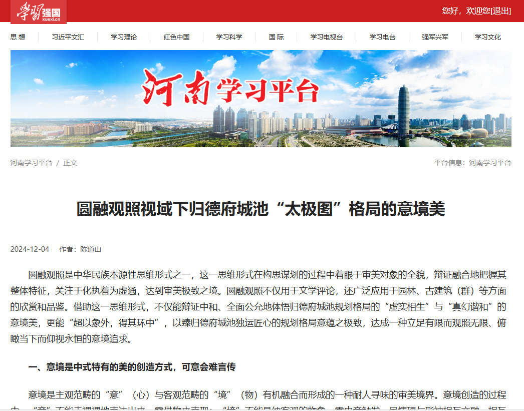 12月4日,“学习强国”河南学习平台发表了在线买世界杯平台副院长陈道山的署名文章——《圆融观照视域下归德府城池“太极图”格局的意境美》。