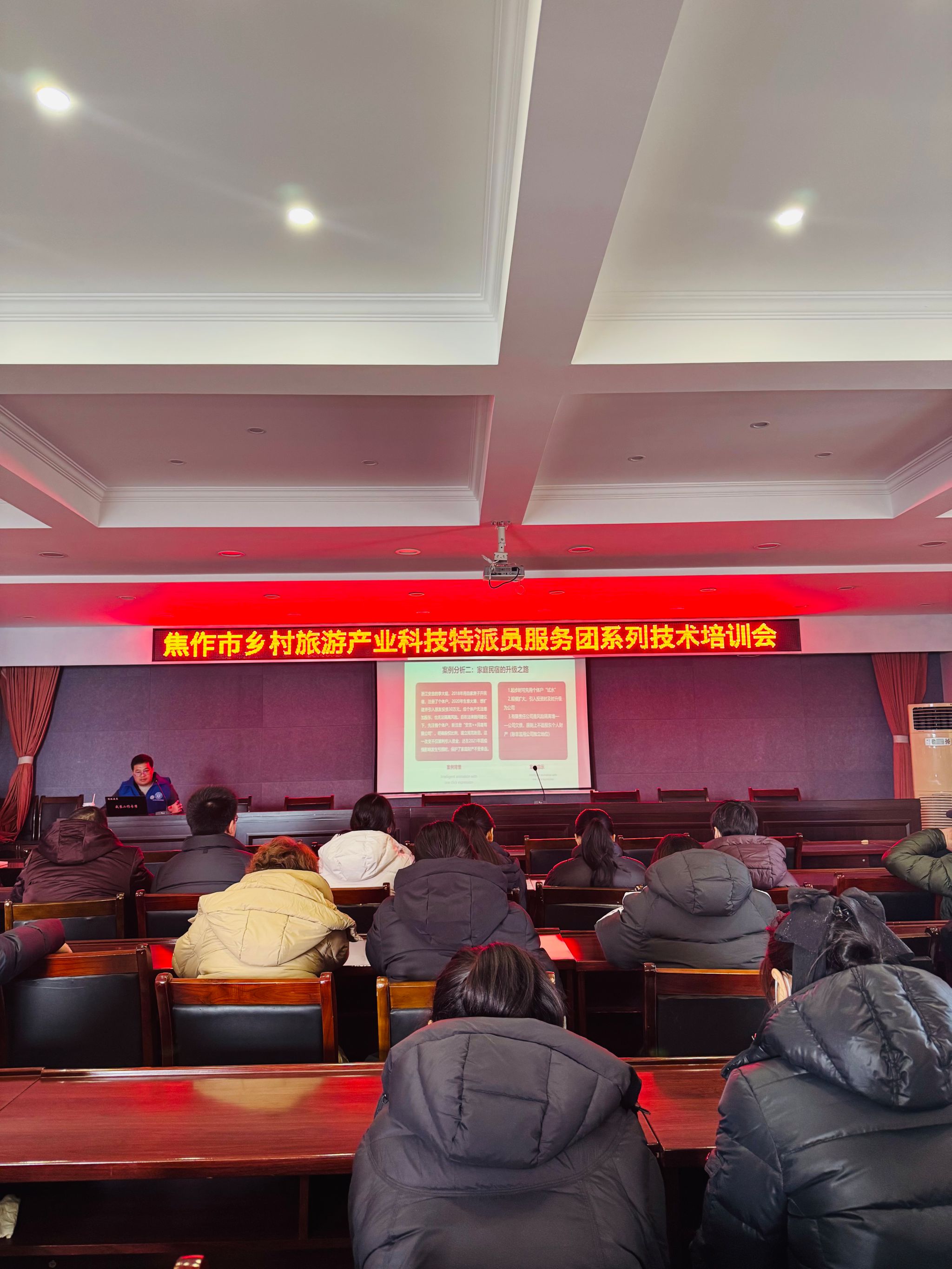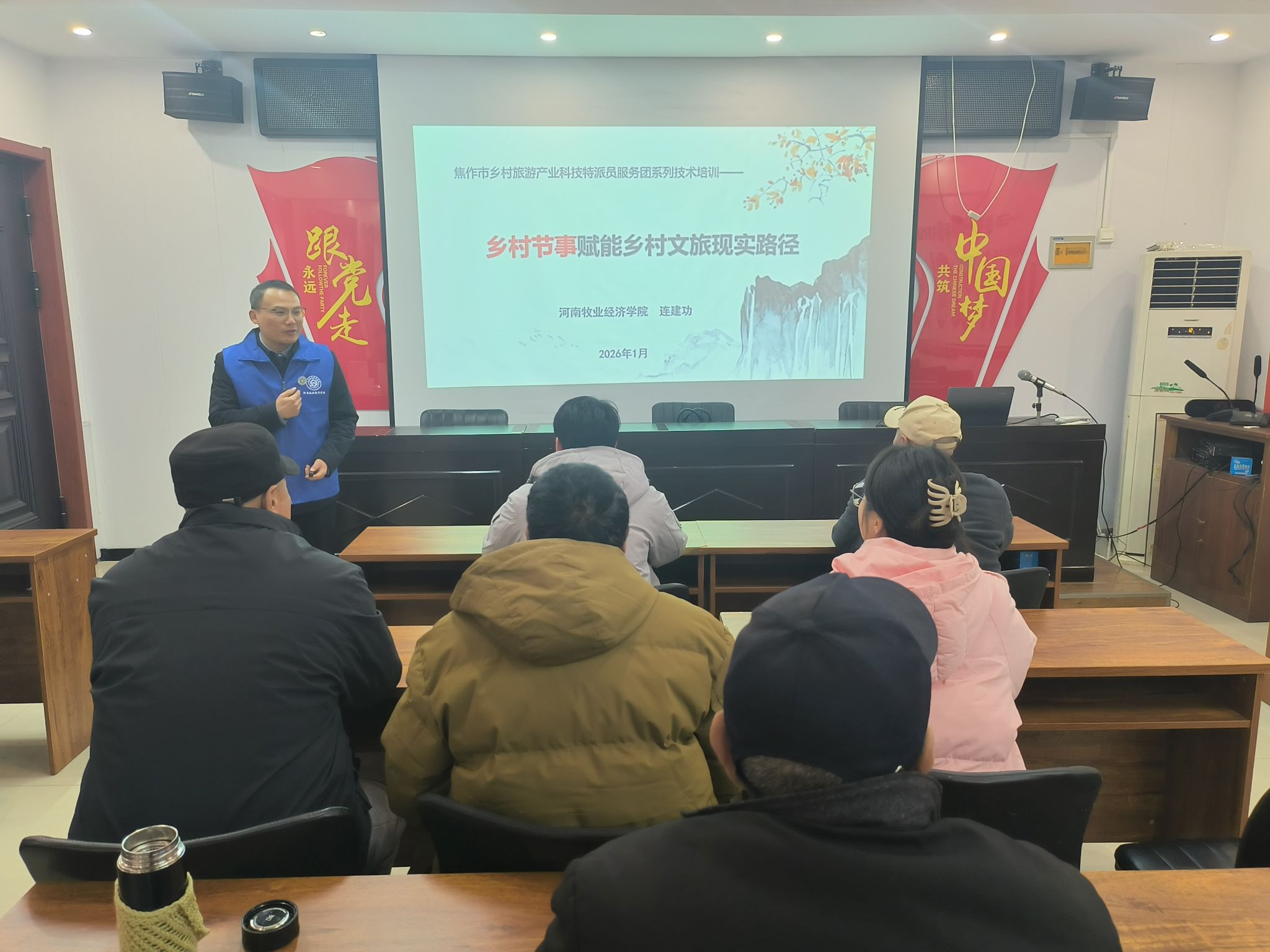 为深化乡村振兴战略实施,助力焦作市解放区乡村旅游产业高质量发展,1月28日下午在线买世界杯平台院长王中雨带领乡村旅游产业科技特派员服务团一行4人赴焦作市解放区开展专题技术培训当地文旅从业者、基层干部及村民代表参加培训,现场反响热烈。